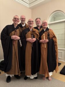Drie Sensei’s en een twee Roshi’s: Jeroen Winkelhorst Sensei, Ben Claessens Roshi, Maurice Genko Knegtel Roshi, Gertjan Mulder Sensei, Marianne van Ham Sensei, (de vierde Sensei, Ineke Vogel Sensei ontbreekt op deze foto) in het Graalhuis, december 2025.